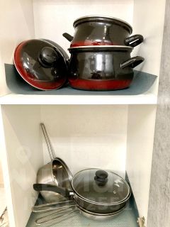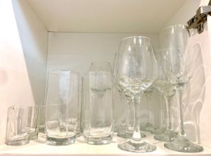 • Посуда, бокалы, кастрюли, сковорода.
