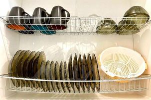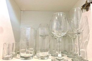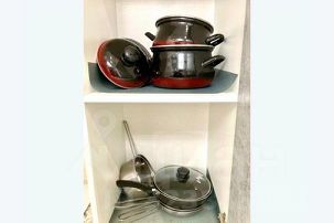 • Посуда, бокалы, кастрюли, сковорода.
