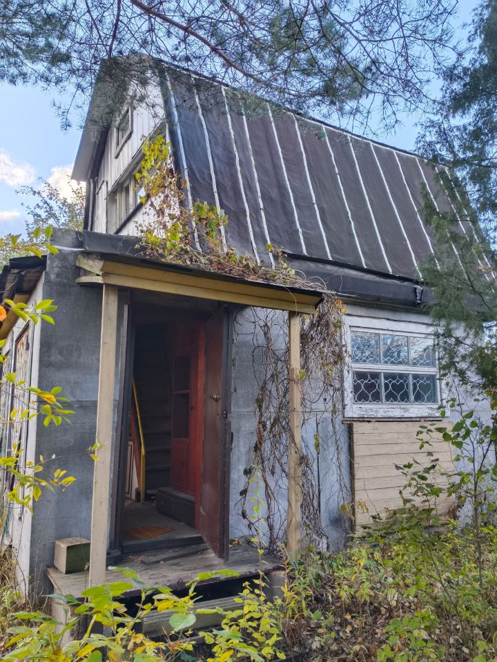 На участке находится садовый домик, кирпич, два этажа, по комнате на каждом этаже. В комнатах кровати/диваны. Строили сами, еще в советские годы, постройка вполне надежная. Даже в таком виде вполне пригоден для сезонного проживания. Также на участке сосны, березы, плодовые деревья.